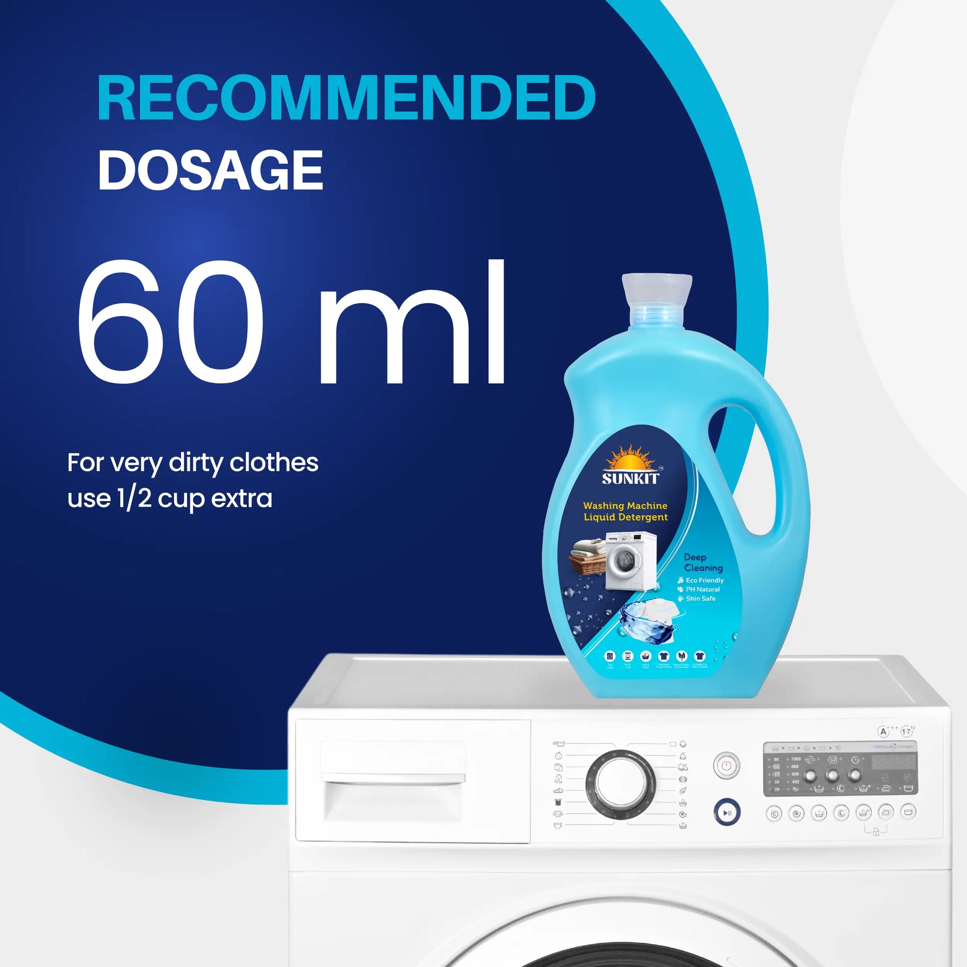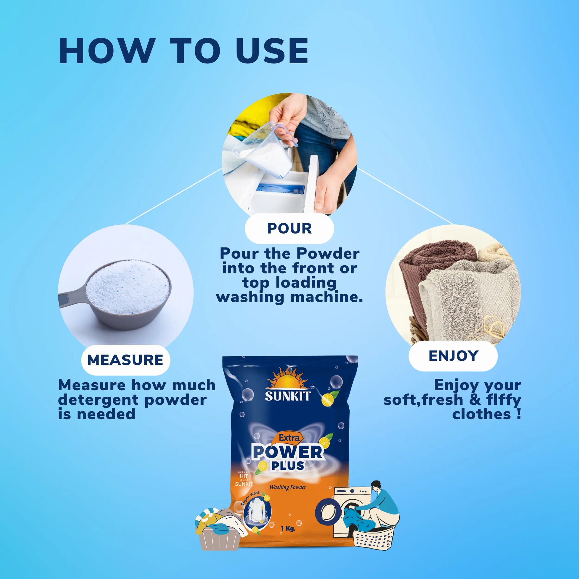 - Pour the Powder or Liquid into the front or top loading washing machine, Measure how much detergent powder is needed, Enjoy your soft, fresh & fluffy clothes!