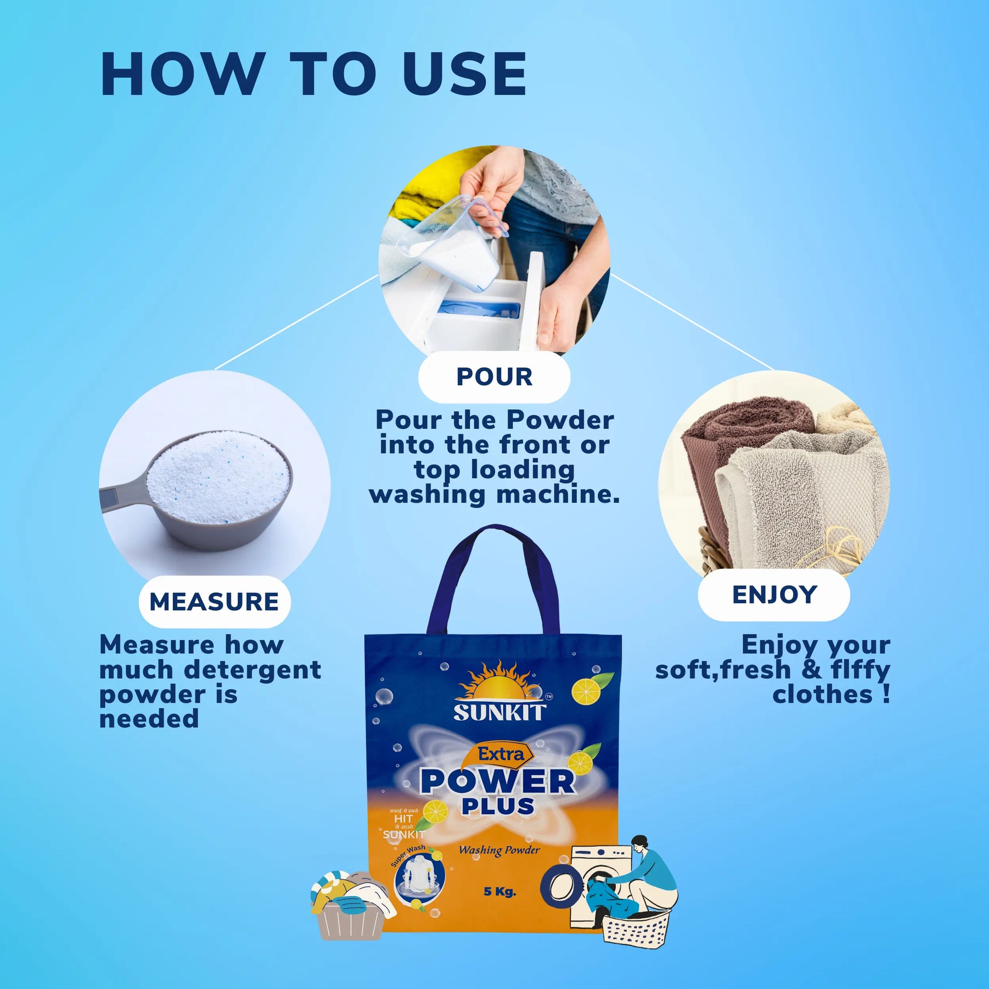 - Pour the Powder or Liquid into the front or top loading washing machine, Measure how much detergent powder is needed, Enjoy your soft, fresh & fluffy clothes!